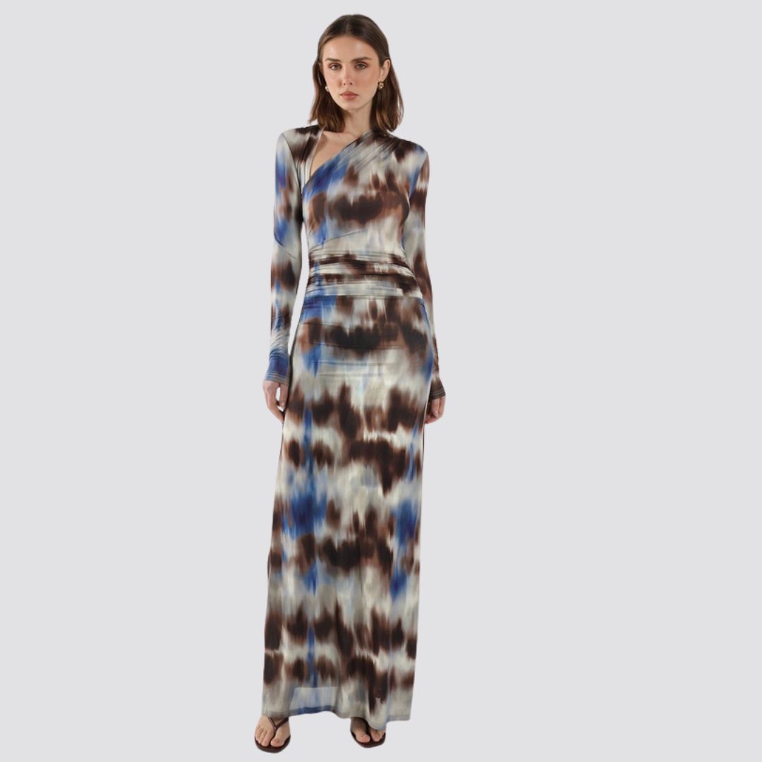 A stunning multi-colour mesh print with an asymmetric neckline, soft gathers through the shoulder and waist, and a flattering fitted bodice that flows effortlessly from the hips down.
