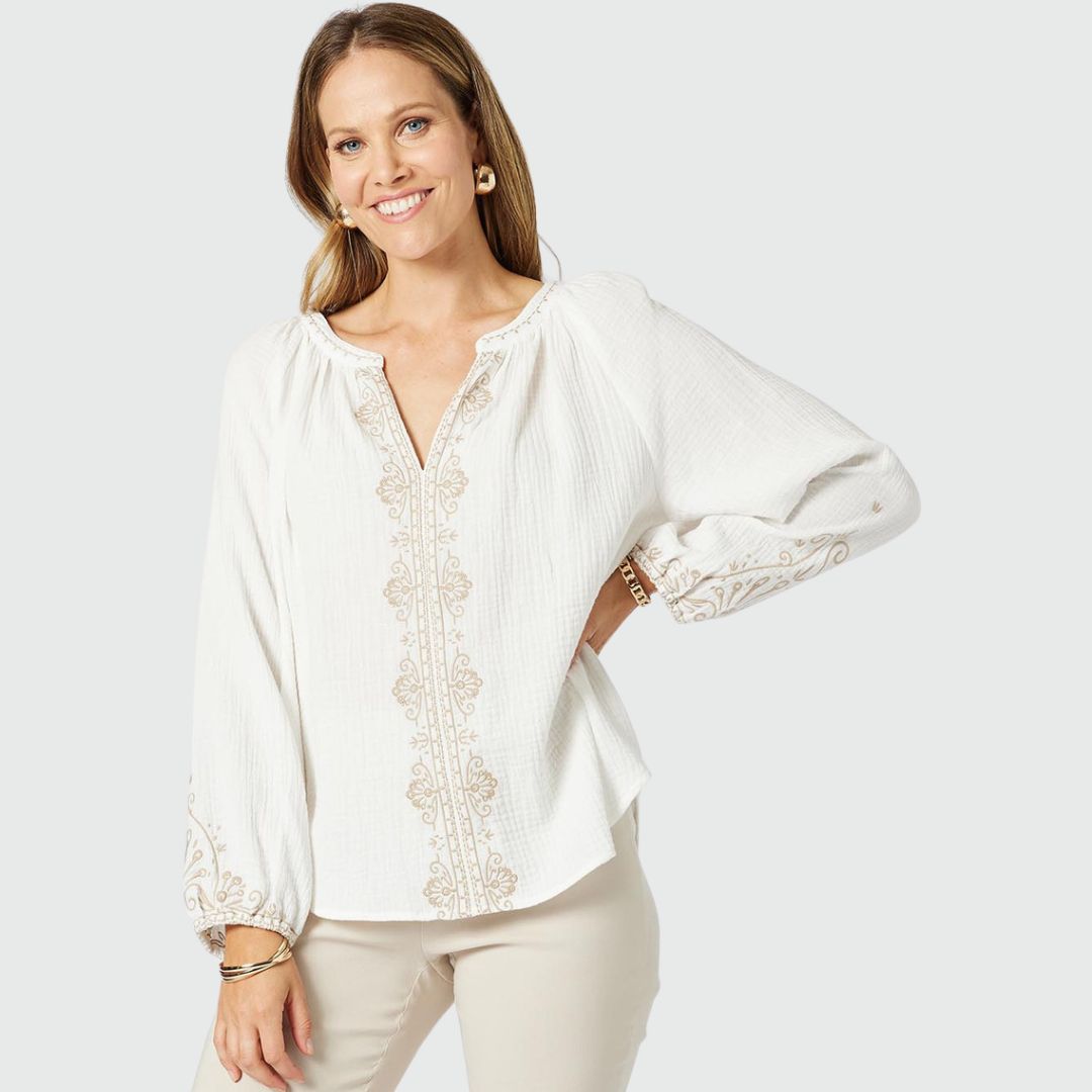 Intricate folk-style embroidery features along the centre placket, neckline and cuffs, giving this classic blouse a relaxed bohemian edge. The flattering deep V neckline with Nehru-style collar and puffed raglan sleeves with gentle elastic cuffs make it easy to wear and easy to love.