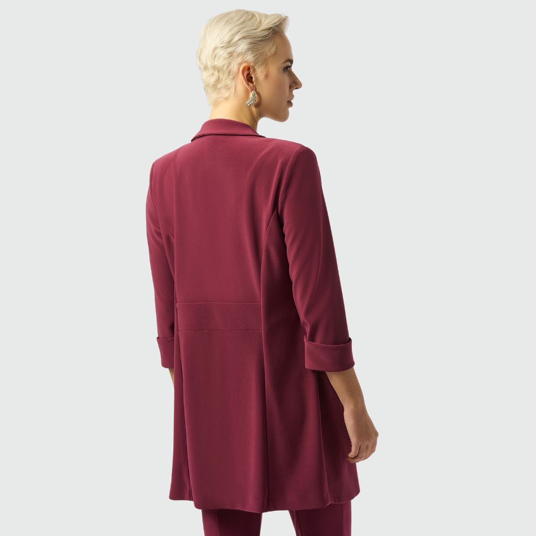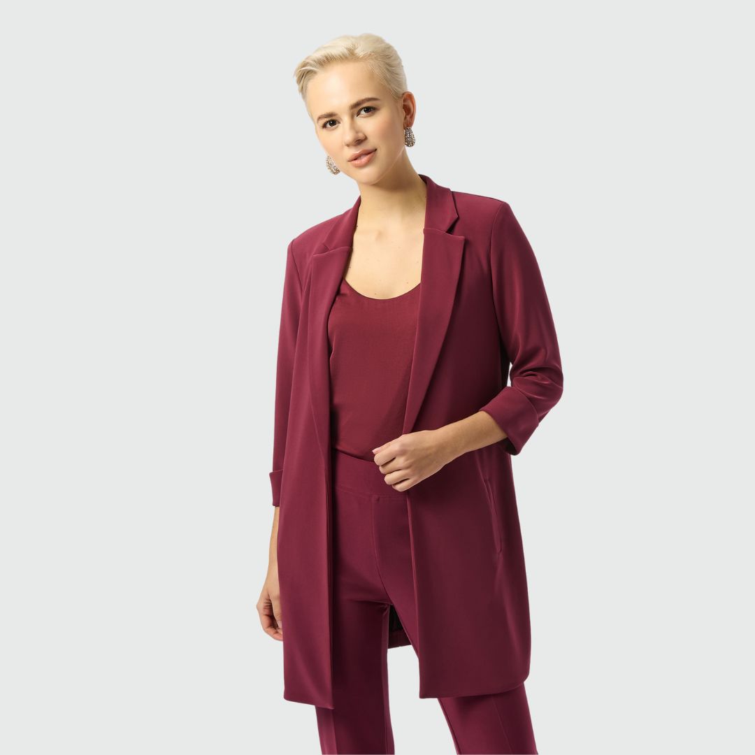 Available in Merlot, Moonstone, and Black, this hip-length blazer features a collared neckline, open front, and 3/4 straight sleeves for a refined, modern silhouette.